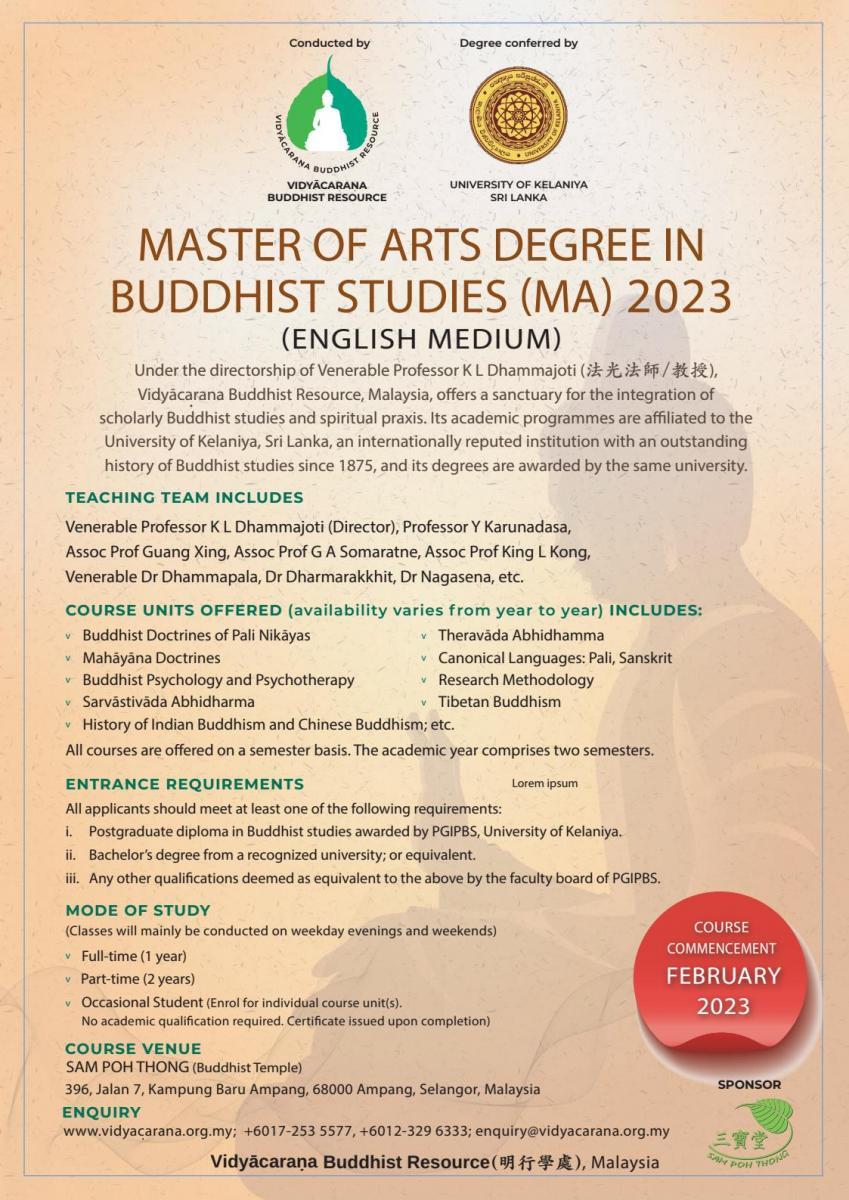 By admin, 5 October, 2022 Master of Arts of Degree in Buddhist Studies (ma) 2023 (English medium) Conducted by VIDYACARANA, BUDDHIST RESOURCE Degree conferred by UNIVERSITY OF KELANIYA, SRI LANKA